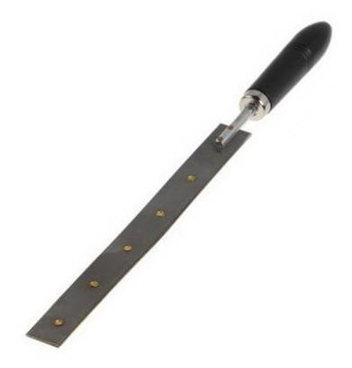 Биметаллическая пластина изготовлена из двух тонких пластин склепанных вместе. Одна из пластин стальная, вторая из латуни. К одному из торцов пластины прикреплена рукоятка. При нагревании или охлаждении биметаллическая пластина изгибается в ту или другую сторону.