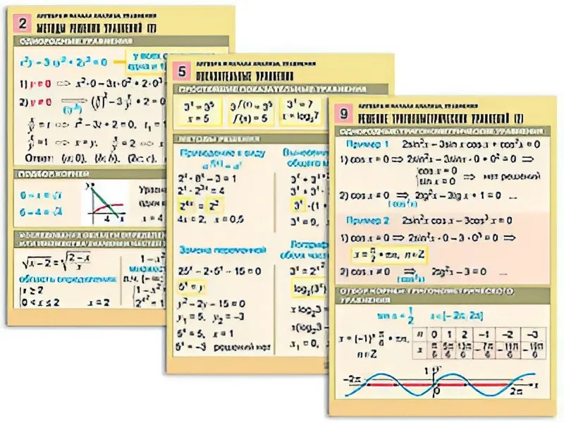 Комплект учебно-наглядных пособий "Алгебра и начала анализа. Уравнения" формата А1 с полноцветной двухсторонней печатью и матовой двухсторонней ламинацией в количестве 12 таблиц