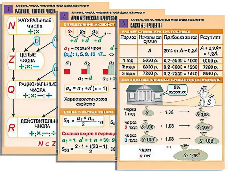 Комплект учебно-наглядных пособий "Алгебра. Числа. Числовые последовательности" формата А1 с полноцветной двухсторонней печатью и матовой двухсторонней ламинацией в количестве 6 таблиц.