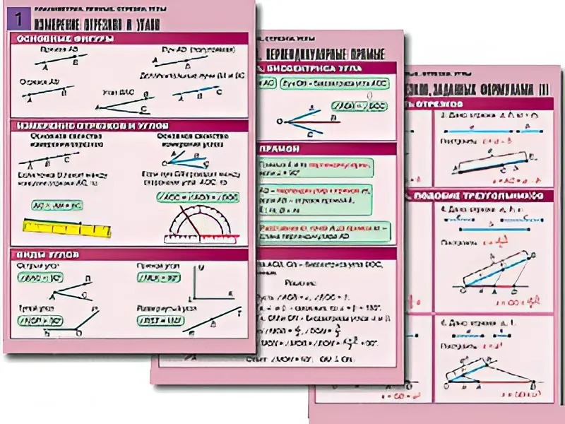 Комплект учебно-наглядных пособий "Планиметрия. Прямые. Отрезки. Углы" формата А1 с полноцветной двухсторонней печатью и матовой двухсторонней ламинацией в количестве 8 таблиц.