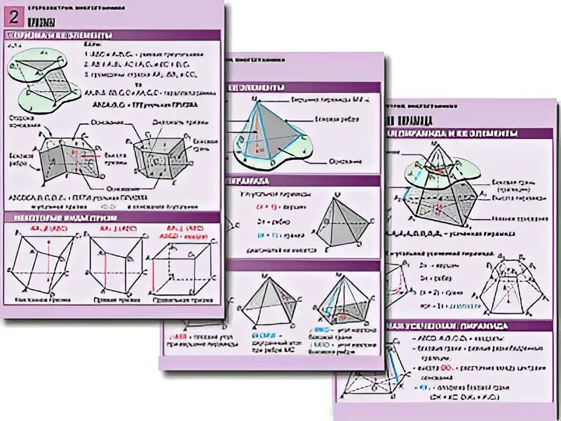 Комплект учебно-наглядных пособий "Стереометрия. Многогранники" формата А1 с полноцветной двухсторонней печатью и матовой двухсторонней ламинацией в количестве 8 таблиц.