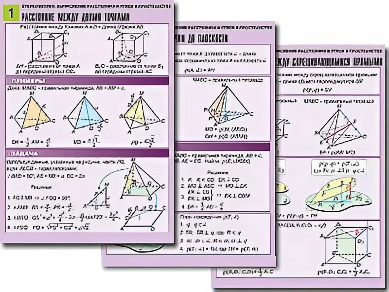 Комплект учебно-наглядных пособий "Стереометрия. Вычисление расстояний и углов в пространстве" формата А1 с полноцветной двухсторонней печатью и матовой двухсторонней ламинацией в количестве 8 таблиц.
