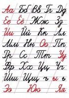 Инструктивная таблица для кабинета начальных классов. Пособие показывает классическое написание прописных и строчных букв русского алфавита.