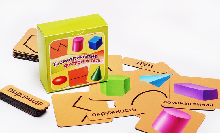 В наборе специально не написали названия фигур и тел на самих карточках, а сделали это отдельно, для того, чтобы можно было поиграть в "угадайку": разместить карточки на магнитной доске или холодильнике, а потом правильно их «подписать». Наигравшись, карточки совсем не обязательно убирать в коробку: фигуры и тела отлично запомнятся, если оставить их на виду у малыша как наглядное учебное пособие.