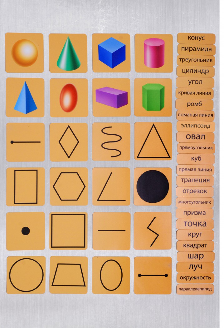 В наборе 48 магнитных карточек: 24 - с изображениями геометрических фигур и тел (размер 7 см * 7 см) и 24 - с их названиями (размер 7 см * 2 см).
