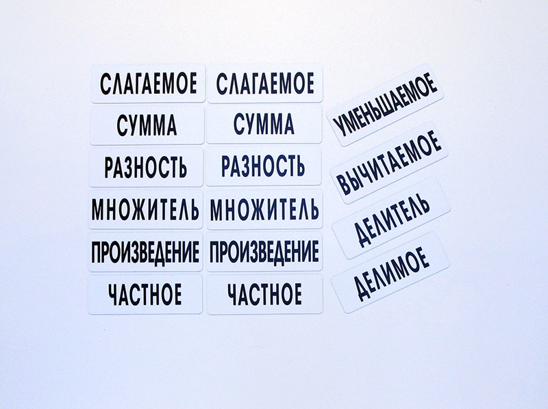 Набор магнитных карточек "Компоненты арифметических действий" станет хорошим помощником учителю начальных классов на уроках математики. В него входят по две карточки с терминами "Слагаемое", "Сумма", "Разность", "Множитель", "Произведение", "Частное" и по одной карточке с терминами" Уменьшаемое", "Вычитаемое", "Делимое" и "Делитель". Карточки хорошо видны с любой парты, прекрасно гнутся и не ломаются. А еще их можно мыть под краном, так как при их изготовлении не используется ни грамма бумаги!