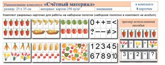 Комплект предназначен для организации устного счета, сравнения групп предметов, схематической записи задач в начальных классах и подготовительных группах детских садов. Для применения комплекта в качестве демонстрационного материала рекомендуется использовать наборное полотно.