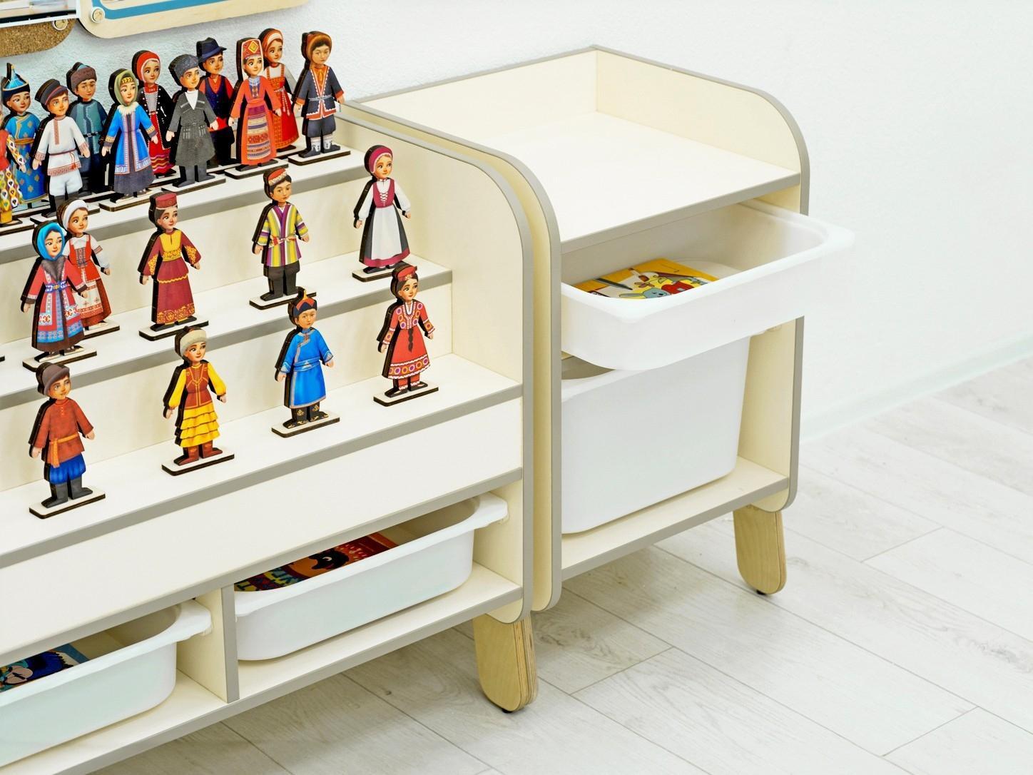 Для изучения национального разнообразия России в комплектации есть куклы в народных костюмах (24 национальности, 48 кукол). Они выполнены из берёзовой фанеры и ДВП с нанесением принтерной печати. Куклы разборные: голова, верхняя часть туловища и нижняя часть надеваются на основу-подставку. Играя в них, дети могут составлять различные вариации одежды куколок – правильные и неправильные, искать пары, разыгрывать сюжетно-ролевые сценки, параллельно запоминая национальности и их традиционные костюмы.