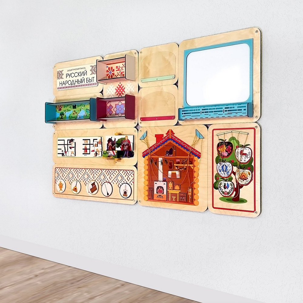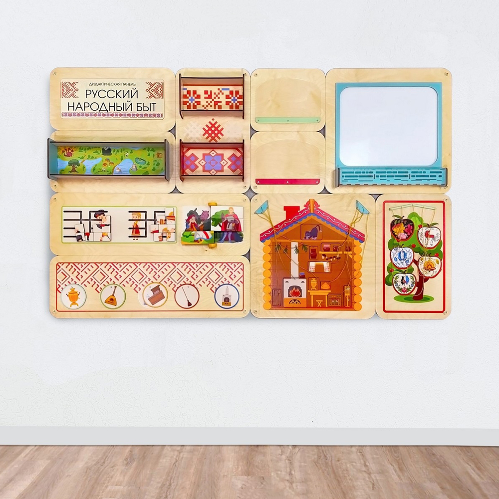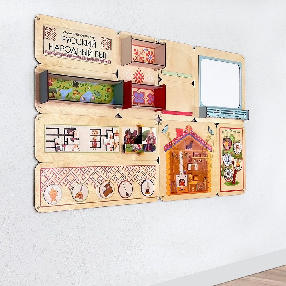 Дидактическая панель «Русский народный быт» знакомит детей с элементами русской народной культуры, развивает логику и мышление, тренирует мелкую моторику и цветовосприятие.
