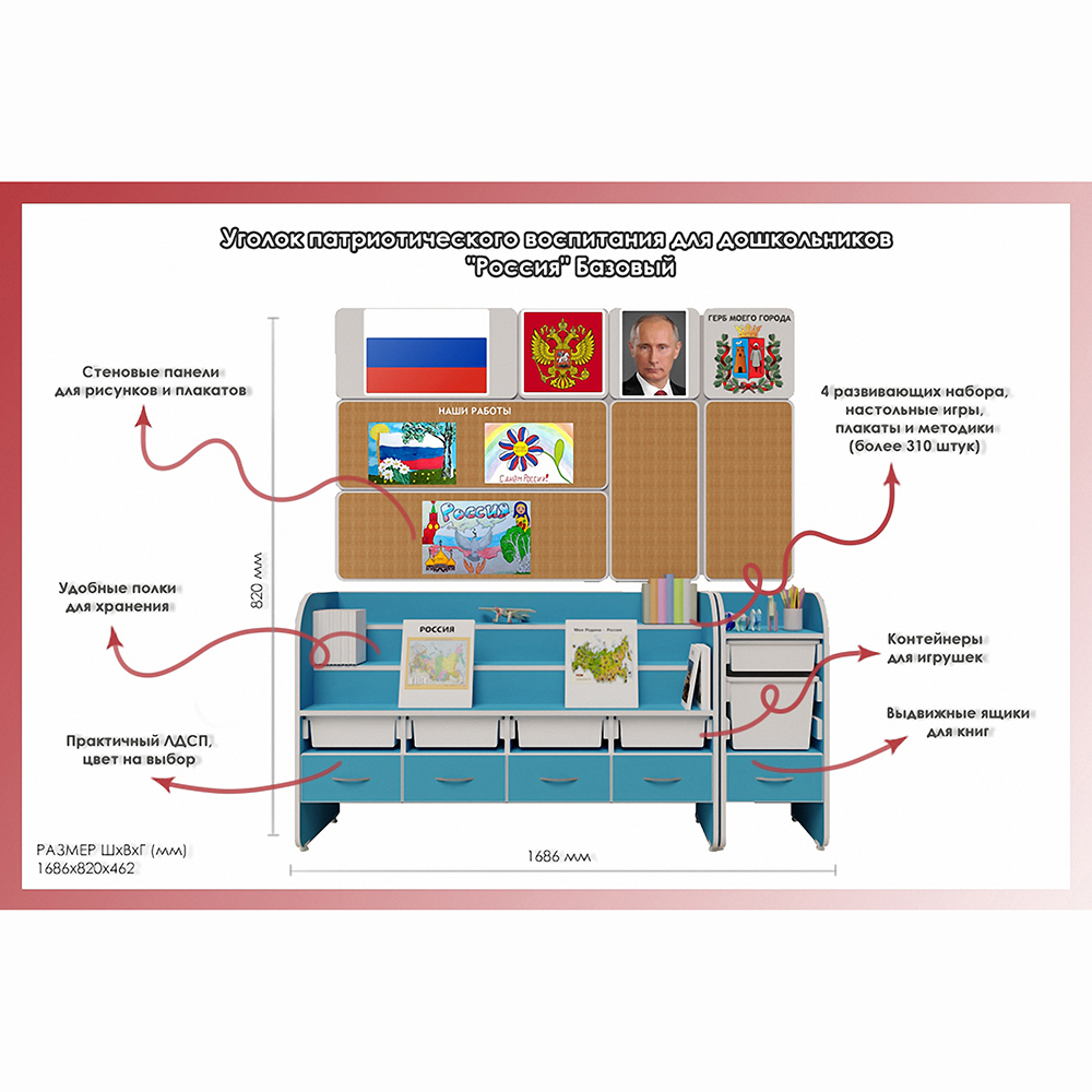 Уголок патриотического воспитания для дошкольников "Россия" Базовый предназначен для проведения занятий по патриотическому воспитанию среди дошкольников в детских садах. Оборудование помогает знакомить детей с традициями и обычаями своей страны, историческими фактами. Применение книг и игр делают обучение более продуктивным, по сравнению с традиционными методами.