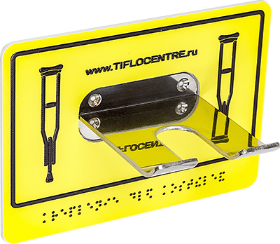 Универсальныйный травмобезопасный крючок предназначен для крепления одновременно 2х костылей или трости. Для слабовидящих — держатель трости контрастно выделяется в интерьере яркой пиктограммой, а для тотально незрячих дополнительно нанесены рельефные надписи с применением системы Брайля.