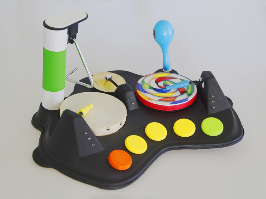 Барабанная установка. Это устройство для проведения музыкальной терапии. Состоит из 5 ударных музыкальных инструментов. Для того, чтобы начать играть на бубне, треугольнике, барабане, кимвале, маракасах, задействуется кнопка с изображением инструментов. При этом установка подсвечивается изнутри многоцветными светодиодами.  Возможность одновременно играть на всех инструментах. Питание, батарейки, в комплекте.
