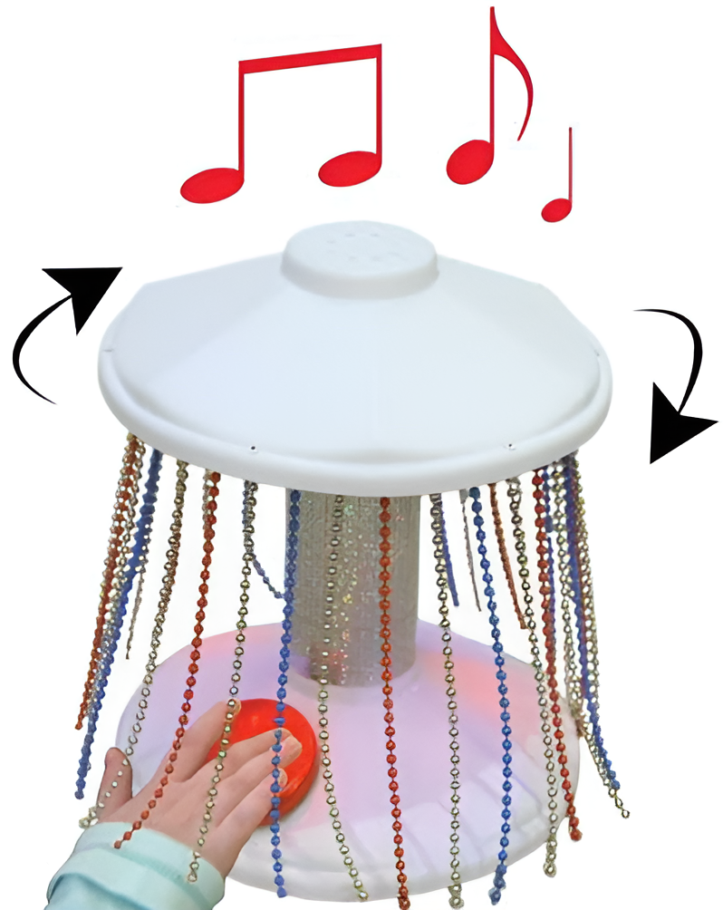 Карусель начнет вращаться, приводя в движение разноцветные нити волшебных бисерных цепочек, которые, вращаясь, будут мягко касаться вашей руки. Заиграет ритмичная музыка, и засверкают красные и синие огоньки.
