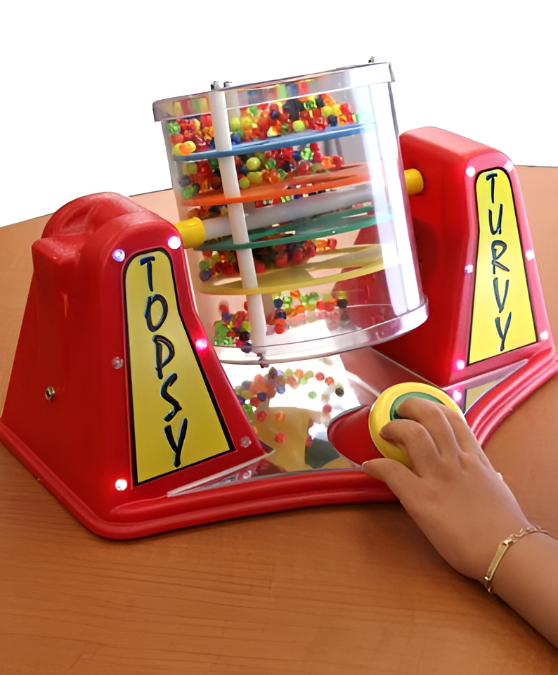 Большой цилиндр начнет вращаться, и вы увидите, как разноцветные бусинки начнут медленно пересыпаться между отсеками внутри цилиндра. При этом вы увидите мигание разноцветных огоньков на корпусе и услышите веселые мелодии (всего их 6). Для создания большего визуального эффекта на нижней части устройства закреплено зеркало. В игрушке можно включить/отключить эффект вибрации.