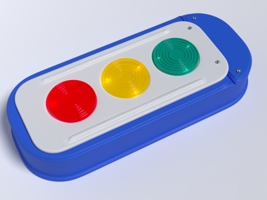 Игра «Светофор» предназначена для детского общего развития и развития детей, имеющих проблемы со слуховым, зрительным и слуховым восприятием информации, коммуникацией. Представляет собой прямоугольный корпус, на котором размещены 3 текстурированные кнопки – красная, желтая и зеленая. Изготовлено из высококачественного ударопрочного пластика, имеет обтекаемые плавные формы без острых краёв и углов. При нажатии на красную кнопку – сработает сигнал автомобильного гудка. При нажатии на желтую кнопку – устройство завибрирует. При нажатии на зелёную кнопку – заиграет приятная музыка.