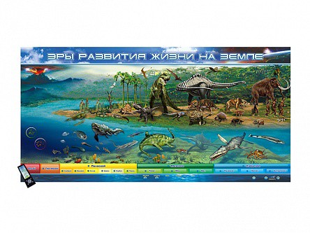 Интерактивный электрифицированный стенд "Эры развития жизни на Земле" представляет собой полноцветную панель с раздельной световой индикацией, на которой наглядно отображены пять основных эр развития жизни на Земле. В конструкции учебного оборудования интегрированы высокочувствительные сенсоры для управления стендом при помощи интерактивного воздействия приемо-передающих устройств. Стенд снабжен программным обеспечением "Виртуальный учитель". Управление работой стенда дополнительно осуществляется с сенсорного беспроводного пульта управления.