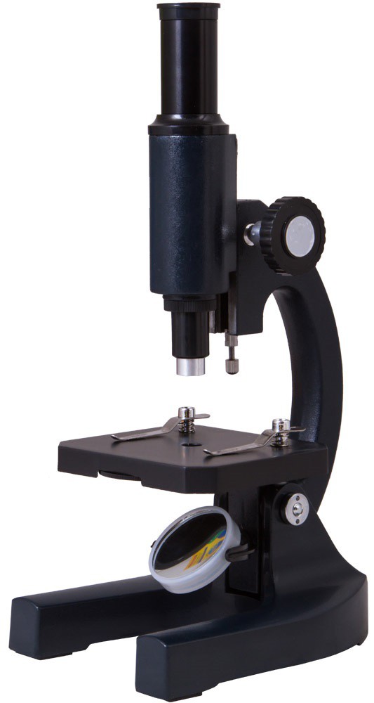 Максимальное увеличение, которое обеспечивает этот микроскоп черного цвета, составляет 200х – этого мало для серьезных исследований, но вполне достаточно для того, чтобы сделать первые шаги в микромир. Окуляр и объектив микроскопа расположены на одной линии, но есть возможность наклонить оптическую трубку микроскопа вместе с предметным столиком для удобства наблюдений (стоит учесть что при работе с жидкими микропрепаратами возможно их стекание).