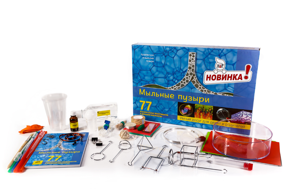 Научный набор для опытов и экспериментов «Мыльные пузыри» — это не только позитивное развлечение, с его помощью можно создать лист Мебиуса, мост из пены и нарисовать оригинальную картину пузырями. Ну а гигантские мыльные пузыри еще никого не оставляли равнодушным!