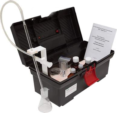 Тест-комплект «Окисляемость перманганатная» представляет собой удобный для переноски, транспортирования и хранения жесткий корпус-укладку, в который компактно размещены необходимые средства измерения, готовые растворы и реагенты, посуда и оборудование, документация.