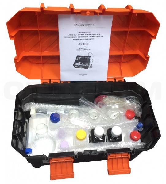 Тест-комплект РК-БПК представляет собой удобный для переноски, транспортирования и хранения жесткий корпус-укладку, в который компактно размещены необходимые средства измерения, готовые растворы и реагенты, посуда и оборудование, документация. Тест-комплект максимально прост и удобен в использовании, позволяет при минимальных затратах осуществлять экспресс-определения концентрации растворенного кислорода (РК) и биохимического потребления кислорода (БПК) в пробах поверхностных вод суши, питьевой и нормативно-очищенной сточной воды.