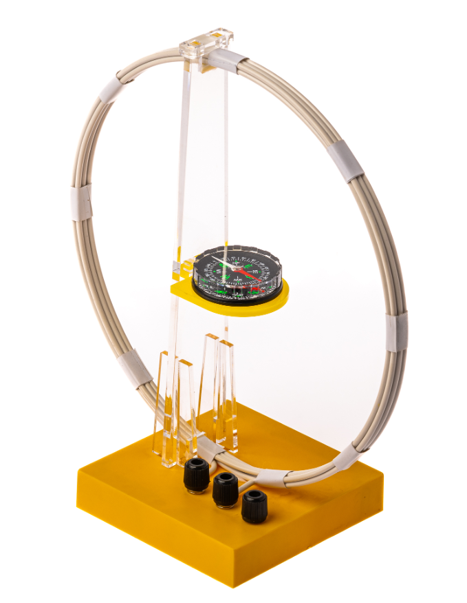 Прибор представляет собой катушку, которая подключается к источнику переменного тока, и при его включении в катушке образовывается магнитное поле. В центре катушки расположен компас с магнитной стрелой, на котором имеется шкала для отсчета угла поворота. Компас закреплен так, что линия шкалы совпадает с плоскостью катушки. Для того чтобы не искажать измеряемое магнитное поле, штатив набора изготовлен из немагнитных материалов.