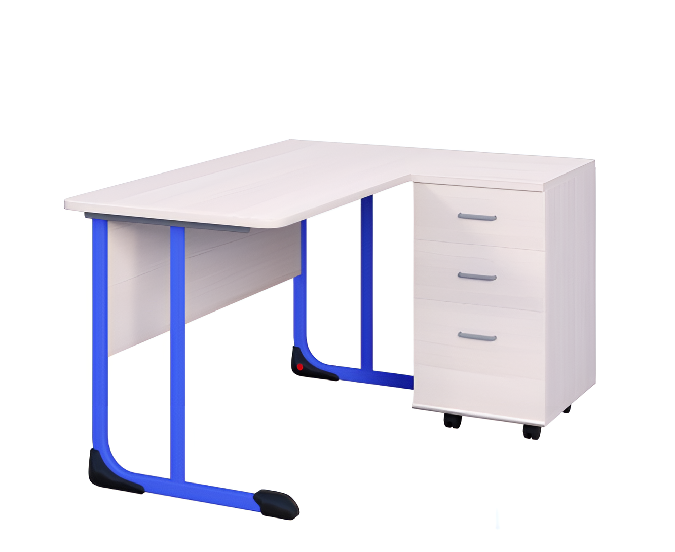 Стол учителя с тумбой из металлического каркаса, крышка стола и тумбы из ЛДСП, имеется царга и кромка ПВХ.