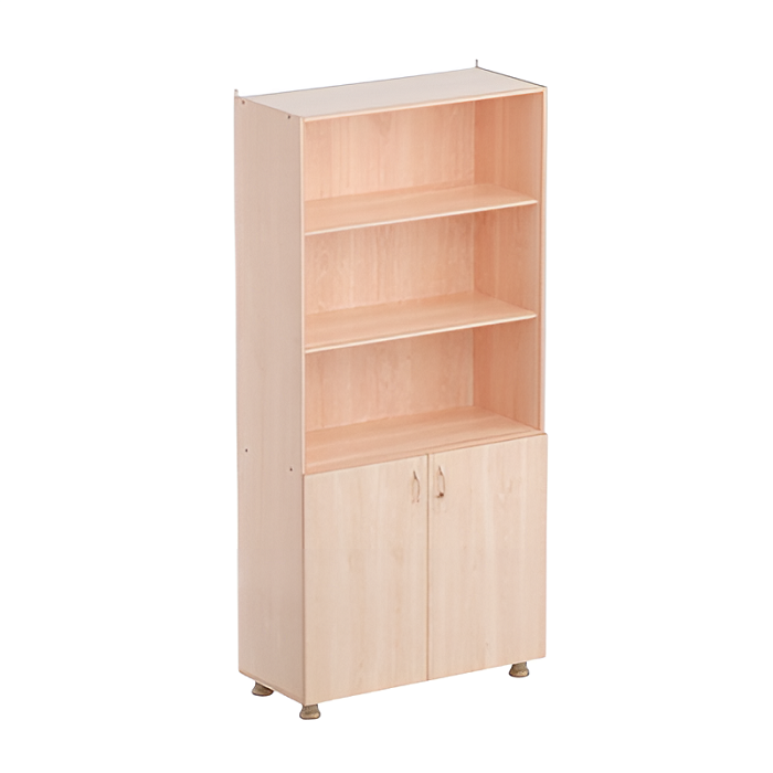 Выполнен из ламинированной ДСП 16 мм, торцы обрамлены кромкой ПВХ. Конструкцией шкафа предусмотрены две секции, верхняя открытая, имеет две полки на полкодержателях, нижняя закрытая, имеет одну полку на полкодержателях. Шкаф снабжен регулируемыми опорами, позволяющими компенсировать неровности пола.
