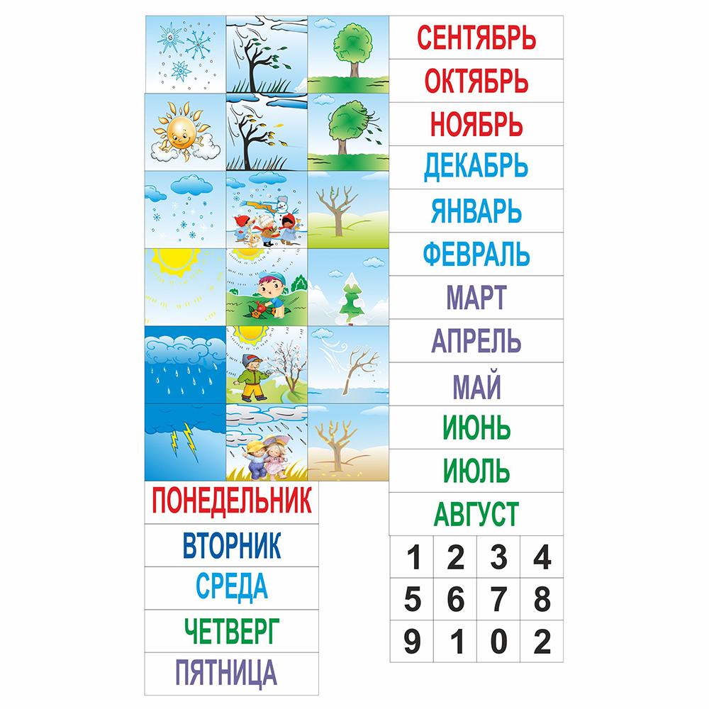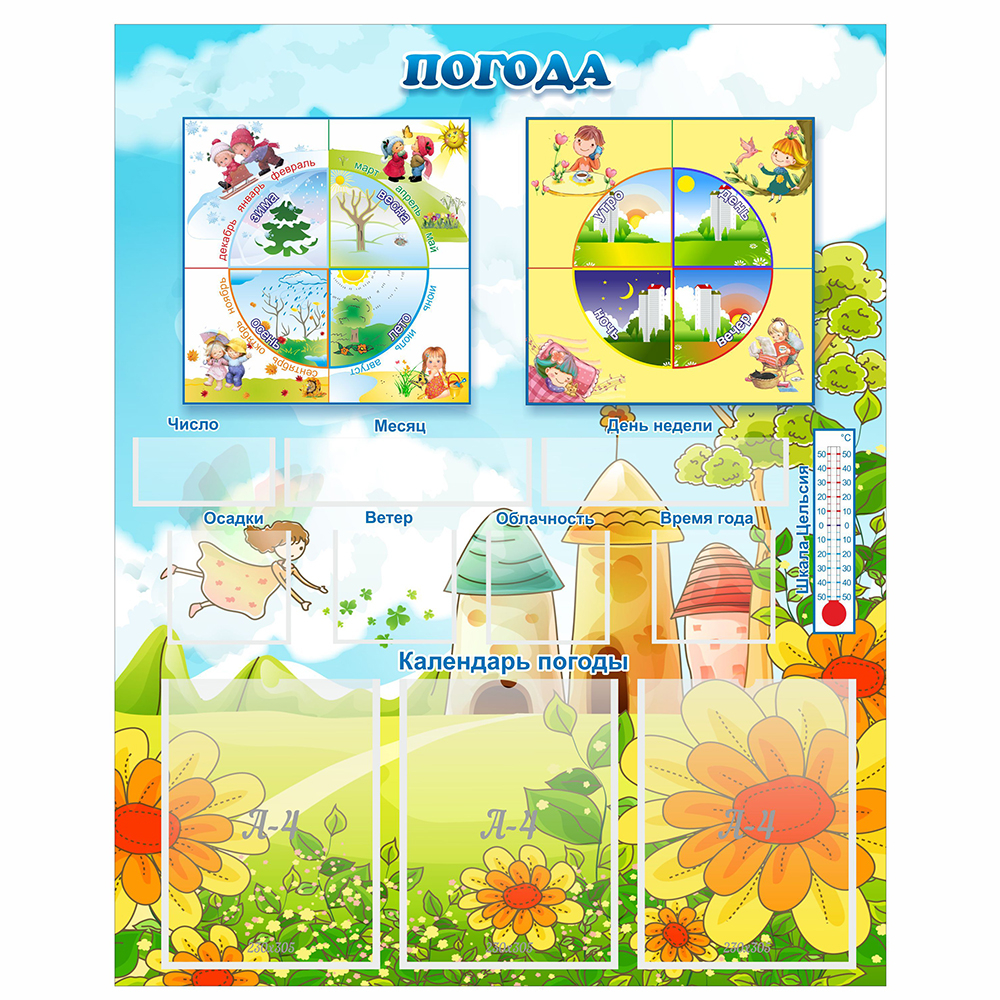 Яркие и красочные картинки прекрасно показывают виды погоды, чтобы детки могли максимально точно ее узнавать. Это прекрасное приобретение для каждого детского садика.