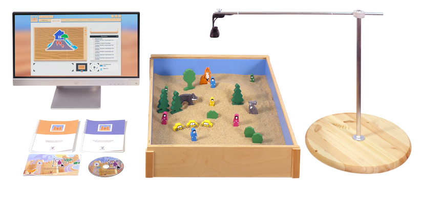 Основными частями представленного комплекса, являются специально разработанное Программное обеспечение и модульная система для видеорегистрации. Программное обеспечение предназначено для ведения базы данных клиентов, интерактивного проведения и протоколирования диагностических сеансов и коррекционно-развивающих сессий, в том числе фото и звукозаписи. Интерактивное картографирование сеансов позволяет наносить на схему пиктограммы фигурок, отражающие расположение объектов на подносе, что помогает отслеживать все месторасположения и перемещения фигурок в поле песочницы, для словесной интерпретации.