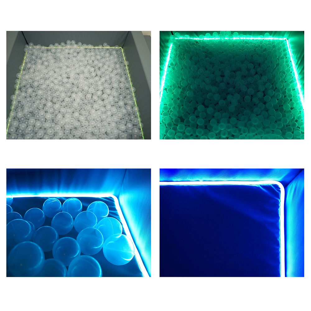 По внутреннему краю бассейна проходит светодиодная подсветка, которая раскрашивает шарики в разные цвета и делает пространство волшебным и удивительным. Подсветка переключается электронным пультом, в ней есть несколько режимов, которые можно подобрать под задачи специалиста.