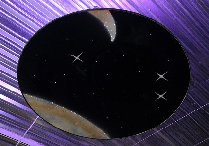 Модуль в виде темного круга, на котором выведены торцы волокон, создающие эффект "звездного неба" с летящими кометами и мерцающими звездами. Фон модуля напоминает космические туманности. С тыльной стороны - подсветка, имитирующая загадочное космическое сияние. Великолепное решение для оформления потолка сенсорной комнаты.