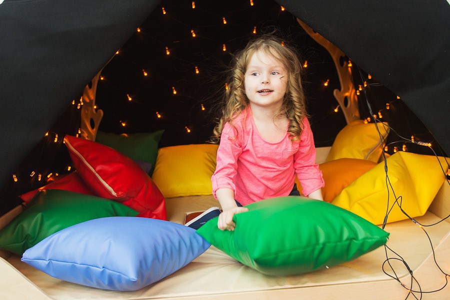 Каркас шатра выполнен из дерева, купол - из высококачественной ткани. Под куполом шатра расположены безопасные лампочки-огоньки (приобретаются отдельно, цена 6400 рублей). В комплекте с шатром поставляется мягкий напольный мат.