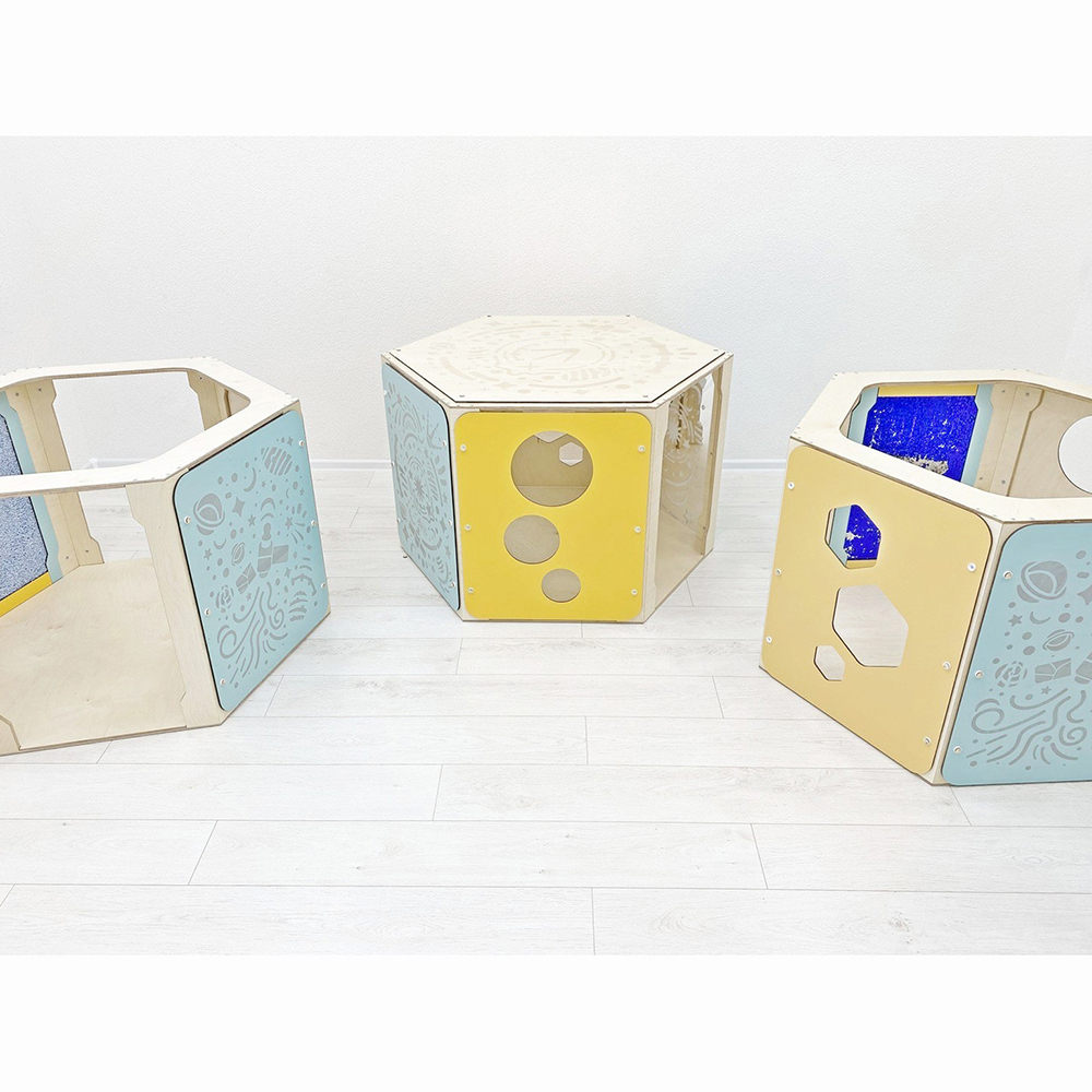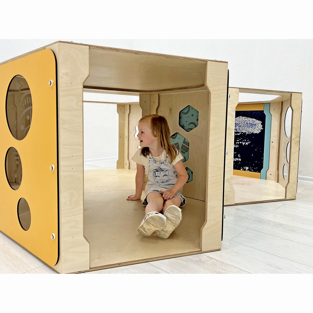 Внутри модули украшены тактильными панелями для развития сенсорной чувствительности, а снаружи – лазерной гравировкой и фигурными окошками. Они идеально стыкуются между собой и позволяют конструировать из них замки и лабиринты для маленьких непосед.