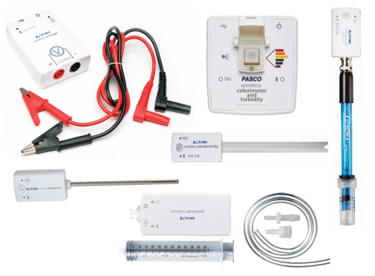 Комплект датчиков PASCO для организации учебно-лабораторной и проектно-исследовательской деятельности по химии в средней и старшей школе включает в себя высокоточные цифровые датчики и мультидатчики. Беспроводные датчики в составе позволяют проводить эксперименты без привязки к месту и времени, быстро, удобно и фиксировать параллельно несколько измерений, а также дают возможность подключения напрямую к компьютеру или любому мобильному устройству. Датчики имеют защиту от пыли и влаги, что позволяет безопасно использовать их во время лабораторного практикума по химии.