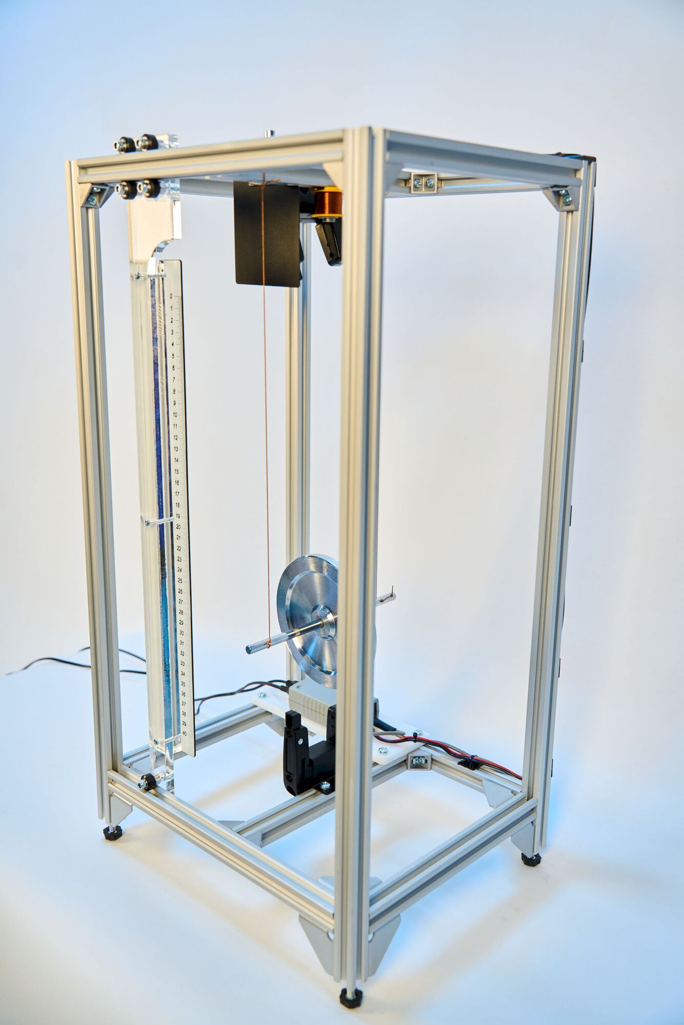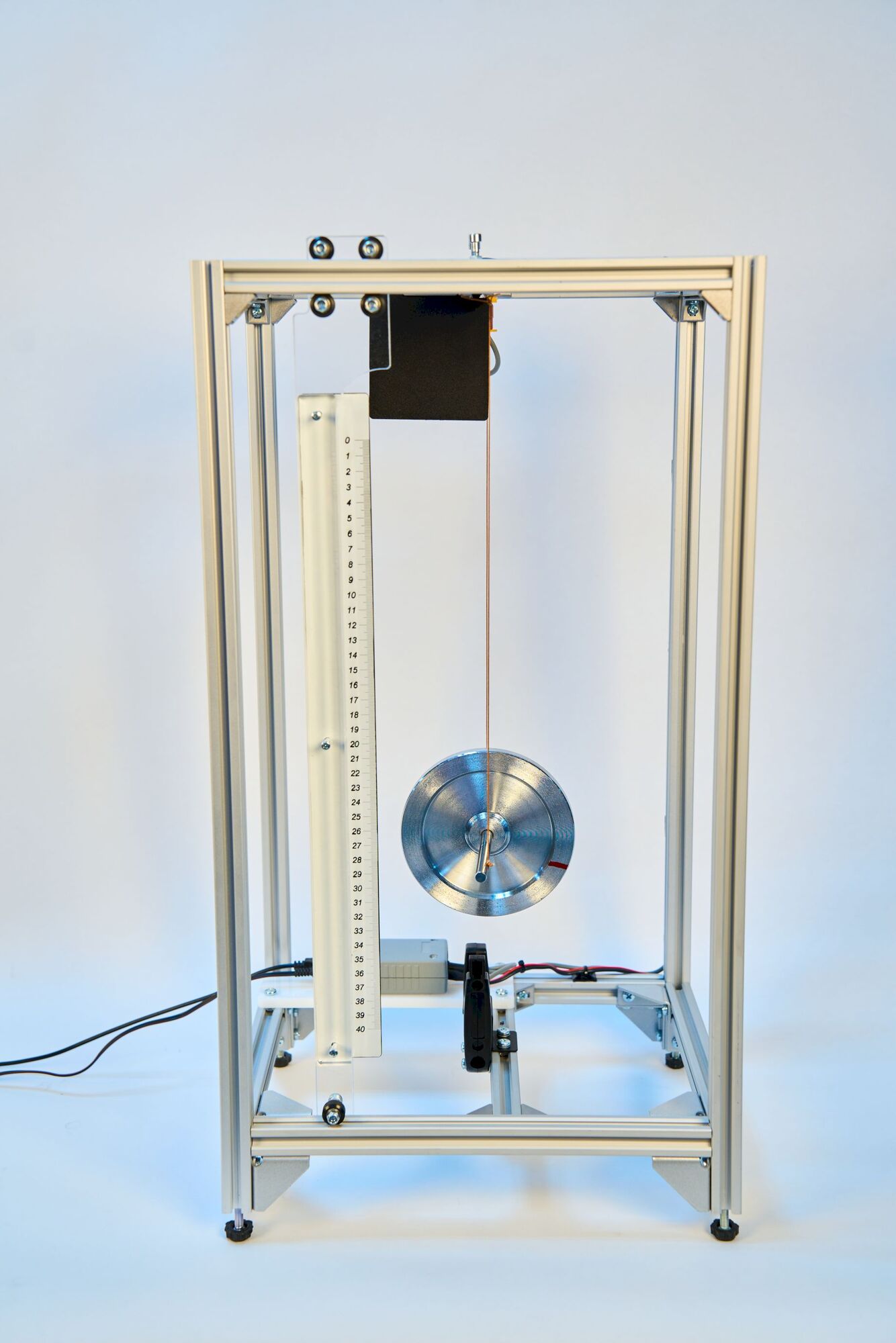 Маятник Максвелла подвешен внутри каркасной конструкции. Для фиксации моментов времени начала движения и прихода диска на определенную высоту вблизи нижней точки траектории используют оптоэлектрические датчики. Запуск движения системы осуществляется с помощью пускового устройства. Поворотная линейка служит для измерения перемещения оси вращения диска при движении от верхней точки до точки, в которой срабатывает нижний оптоэлектрический датчик.