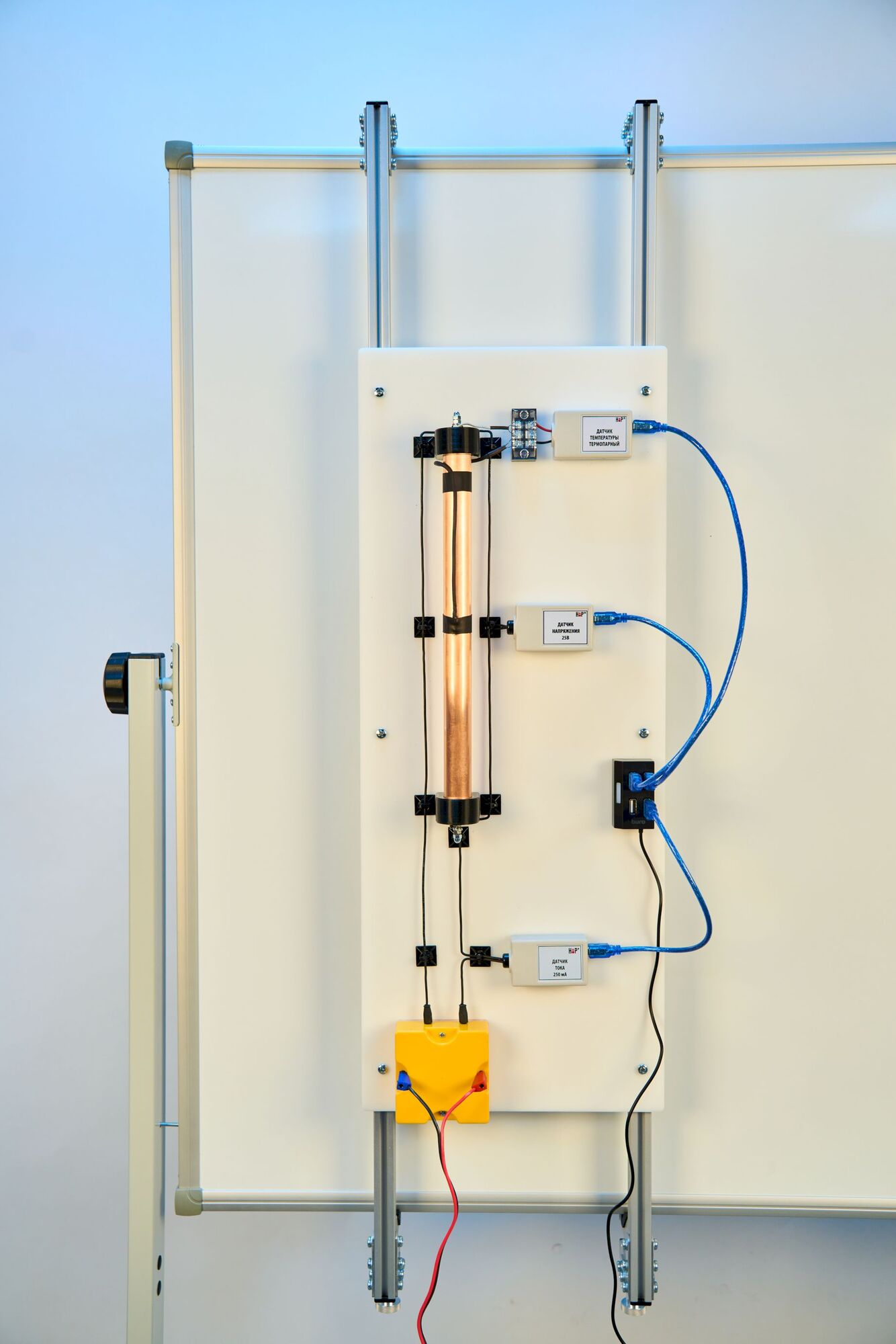 Конструкция лабораторной установки обеспечивает вертикальное расположение сборки из двух коаксиальных трубок. Внутренняя трубка является нагревателем. Тепловая энергия, выделяемая внутренней трубкой, передается через воздушный промежуток к внешней трубке и рассеивается в окружающее пространство. Питание нагревателя осуществляется от блока питания регулируемого, вмонтированного в установку.