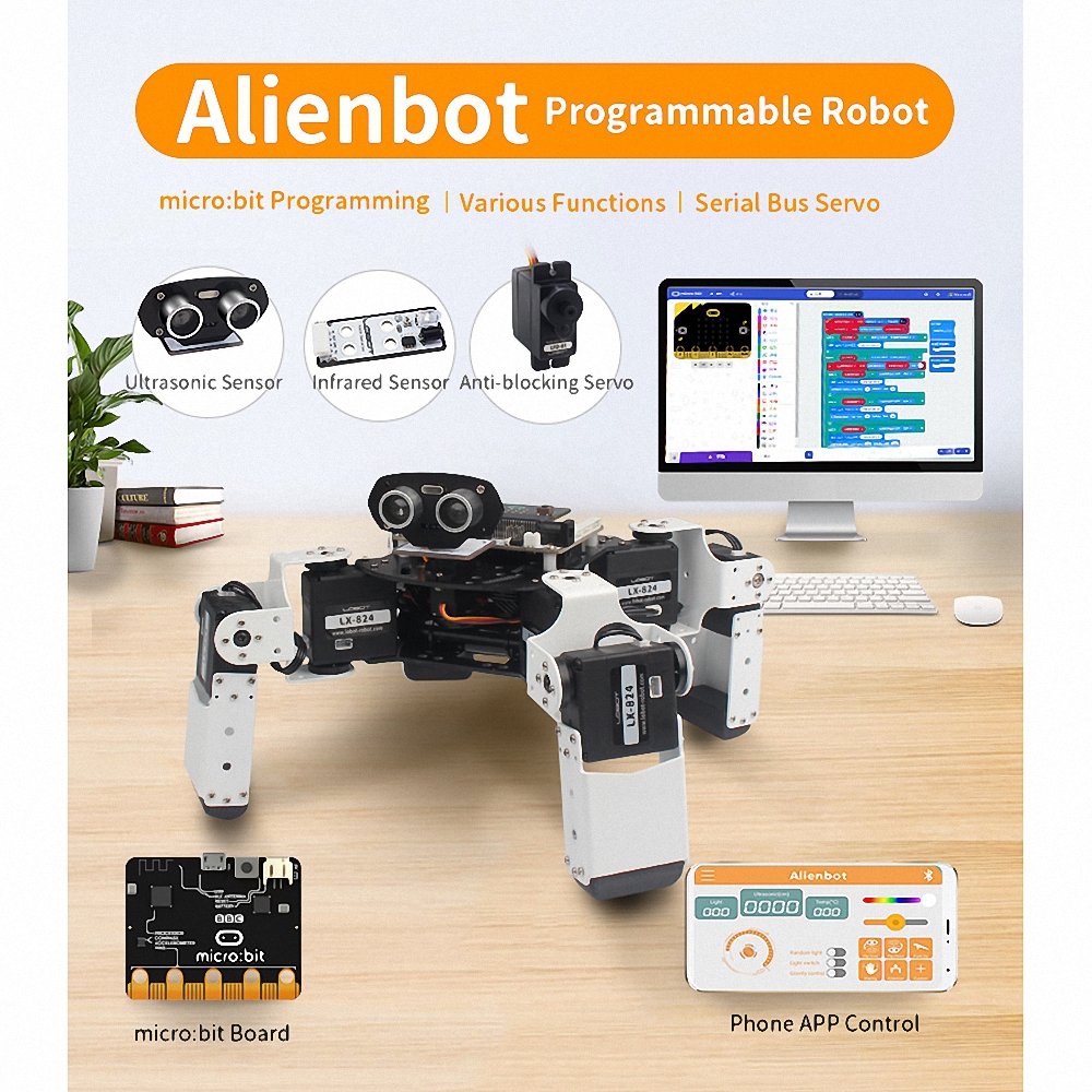 Конструктор для изучения многокомпонентных робототехнических систем. Программируемый робот оснащен необходимыми электронными компонентами для выполнения следующих действий: умение ползать, выполнять кувырки, ложиться и вставать, функции обнаружения и объезда препятствий, избегания падения и т.д Каркас робота может быть доработан учащимися с помощью лего-деталей. Программирование осуществляется в среде Scratch, MakeCode, Python. Управление происходит посредством джойстика или с помощью мобильного приложения.