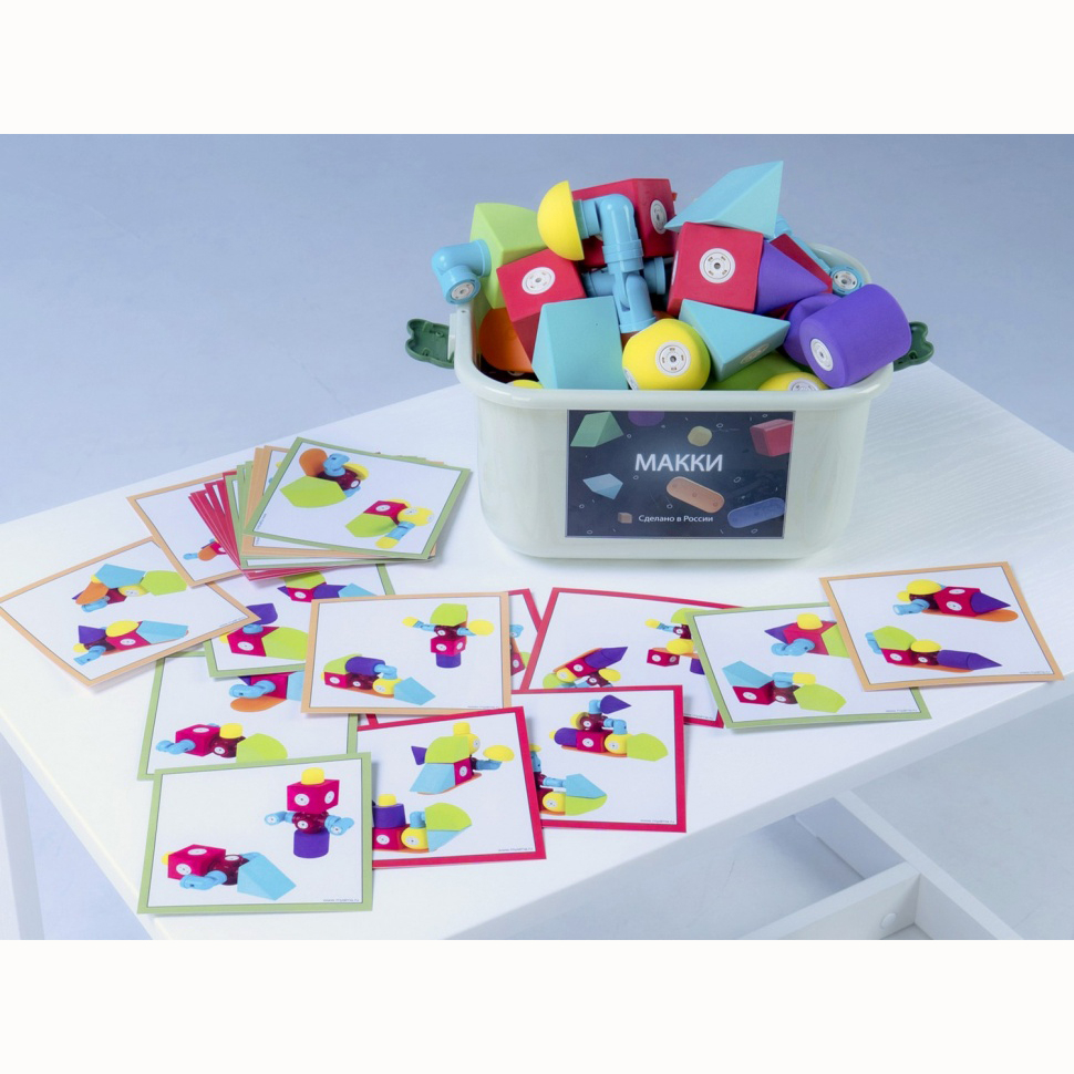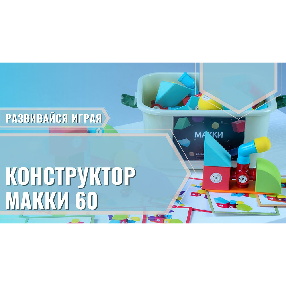 Конструктор «МАККИ 60» — набор цветных магнитных деталей, крупных геометрических фигур с магнитными креплениями. Детали конструктора окрашены в приятные однотонные цвета, со звуковым эффектом погремушки.