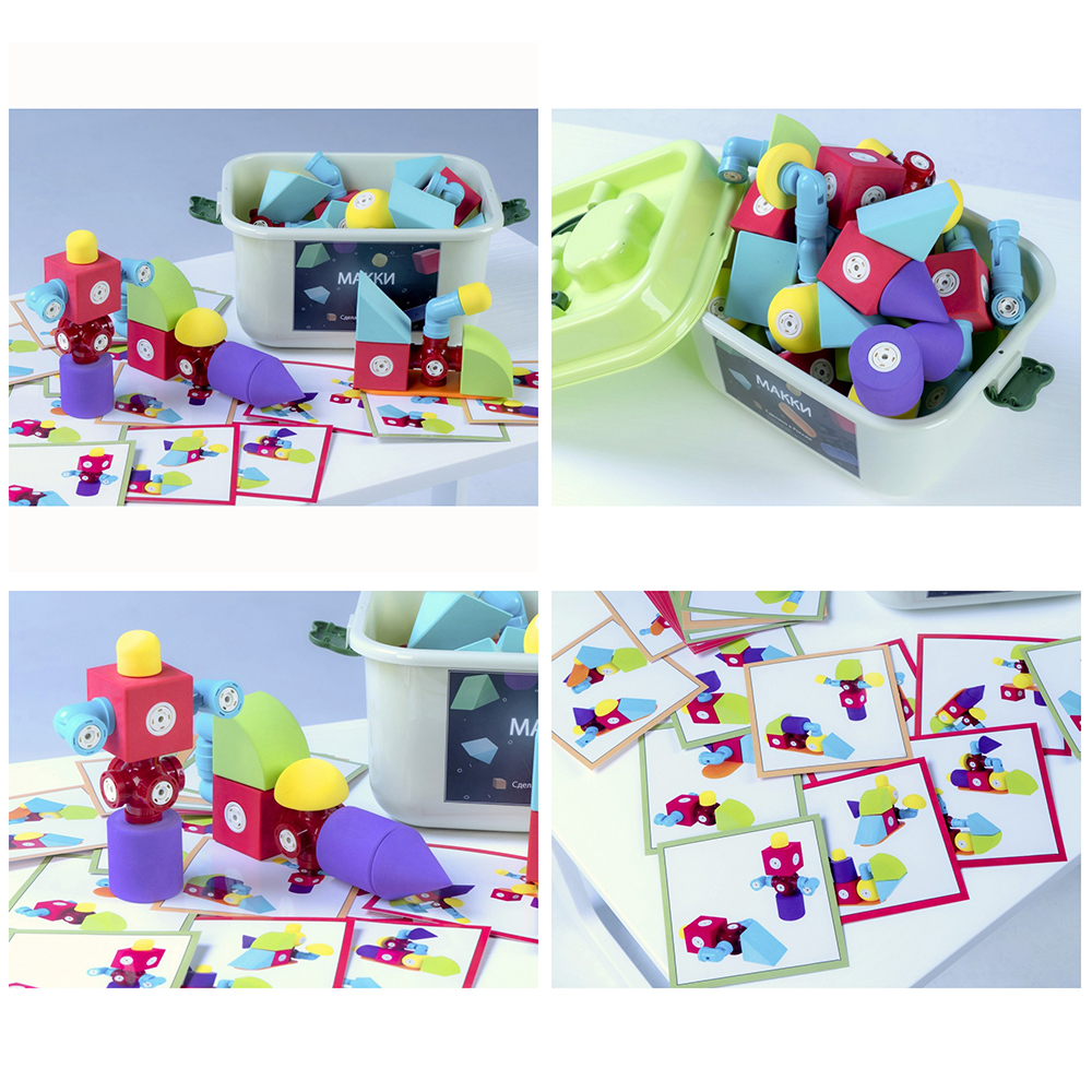 Состав набора: Мягкие магнитные детали: Кубы с магнитом на каждой стороне 5 шт. Полукруглые 3D треугольники 5 шт. 3D треугольники с магнитом с двух сторон 5 шт.Сферы с магнитом с шести сторон 5 шт. Цилиндры с полусферическими концами с магнитами на одной стороне 5 шт. Полусферы с магнитом на одной стороне 5 шт. 3D конусы с магнитом на одной стороне 5 шт. Цилиндры с магнитом с двух сторон 5 шт. Цвет деталей 5 цветов. Магнитные детали: Пластины с тремя магнитами 5 шт. Сгибающиеся соединительные трубки с магнитами с двух сторон 10 шт. Квадратные трубы с магнитом на каждой стороне 5 шт. Цвета деталей 3 цвета. Карточки с примерами моделей 25 шт. Количество моделей 50 моделей. Виды моделей животные, птицы, самолёты, вертолёты, космолёты, корабли, лодки, машины, роботы Методическое пособие с акцентом на проведение групповых занятий. Количество участников от 1 до 5 человек. Уровни сложности занятий легкий, средний, сложный. Количество упражнений 31 шт. Темы занятий Слуховое восприятие, Развитие речи, Мелкая и крупная моторика, Восприятие формы, Восприятие цвета, Восприятие количества больше – меньше, Восприятие размера больше – меньше.
