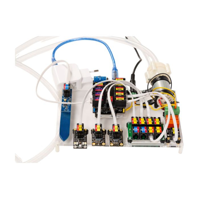 Образовательный набор «Стартовый ЙоТик М4» предназначен для начального уровня обучения по основным понятиям технологии «Интернет вещей» (IoT) в концепции «Умное сельское хозяйство» для изучения базовых функций для выращивания: автополив, умное освещение, мониторинг данных.