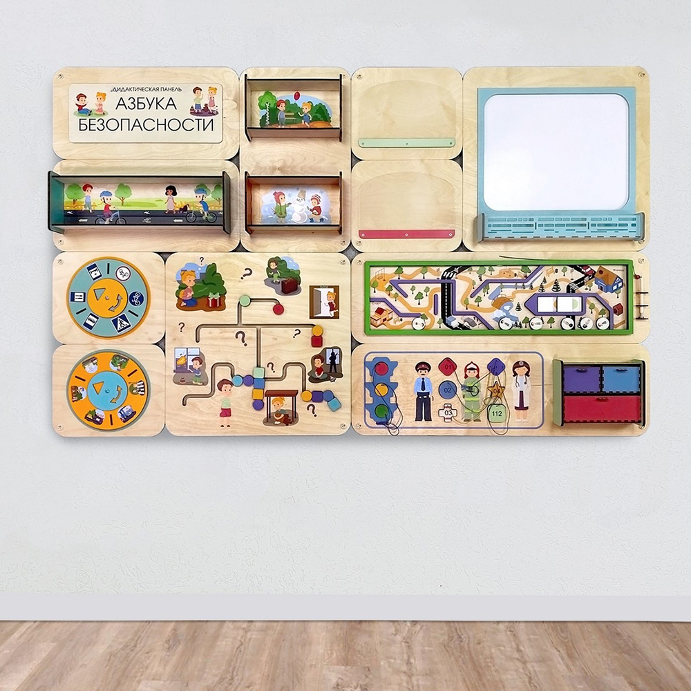 - Занятия с панелью «Азбука безопасности» помогут ребёнку освоить жизненно важные навыки поведения. Дети формируют представления о правилах безопасности дома и в общественных местах, учатся строить причинно-следственные связи, развивают логическое мышление, мелкую моторику, цветовосприятие.