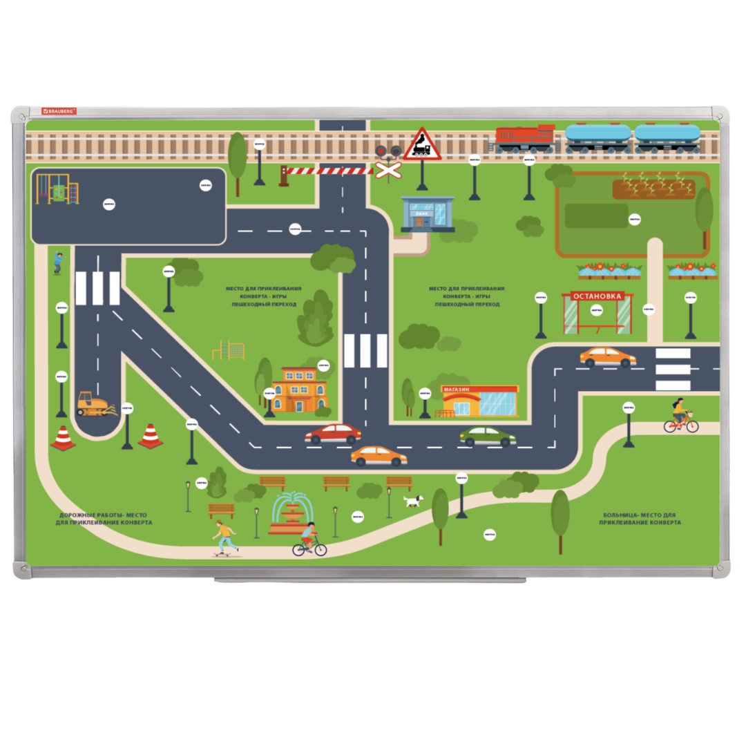 Доска представляет собой игру с комплектом магнитных знаков дорожного движения, 2 фигурками людей, 2 фигурками машинок. Цель игры - добраться до определенного места не нарушая правил дорожного движения. Обучайте детей ПДД в игровой форме с большой и яркой магнитно-маркерной доской "Безопасный маршрут школьника"!