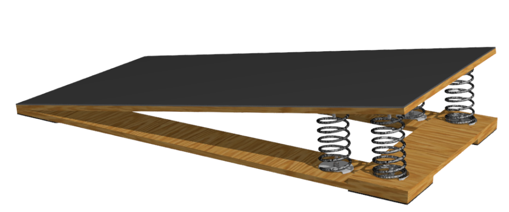 Представляет собой сборную конструкцию, состоящую из верхней площадки и основания (фанера 15мм), 4х стальных амортизирующих пружин, вставленных между верхней и нижней поверхностью мостика, обеспечивающих высокий отскок и прочность. Площадка имеет ковровое покрытие, препятствующее скольжение ног во время выполнения прыжков.