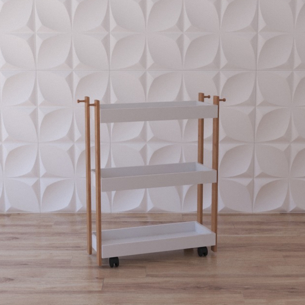 Стеллаж имеет лёгкую и мобильную конструкцию, необходим для расположения спортивного инвентаря. Изготовлен в простой форме, имеет 3 полочки белого цвета, о бокам размещены 4 крючка, внизу же есть 4 колёсика для удобства передвижения. Благодаря этому стеллажу размещение и перевозка спортивного оборудования небольших размеров (мячики, скакалки, палочки для челночного бега и т.д.) станет организованным. Этот стеллаж станет отличным модулем для оснащения помещений. Модуль предусмотрен для спортивных залов различных учреждений.