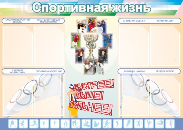 В стенах школьного учреждения рождаются не только гении, но и великие спортсмены, которым надо помогать развиваться и направлять. Стенд «Спортивная жизнь» сделан для того, чтобы руководители могли освещать спортивные мероприятия, рекорды школы, отличившихся спортсменов, а восемь карманов формата А4, расположенные на стенде, позволяют менять информацию по мере необходимости. Стенд оформлен ярко и красочно, что притягивает взгляды учащихся, а легкий материал стенда позволяет при необходимости перевозить его и крепить на двухсторонний скотч или небольшие саморезы на любую стену.