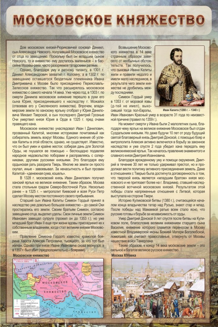Сложно переоценить роль Ивана Калиты в Московском княжестве. Именно поэтому на данном стенде, привлекающем взгляд, находится именно портрет этого князя. К тому же, картина с изображением Москвы того далекого времени, тоже имеется на стенде. Ровно, как и карта легендарного Московского княжества. Безусловно, уйма интересной информации, расположенной на этом стенде, не сможет остаться незамеченной, хотя бы одним из учеников. Что ж, ведь именно для школьников, подобные стенды и помещают на стенах кабинетов истории. И это правильно! Нет ничего хуже, нежели голые стены в кабинете, отвечающем за одну из дисциплин. Ведь не фотографиями учеников, в конце концов, занимать их! Это делается, только лишь в младших классах, да и то, далеко ни во всех школах.