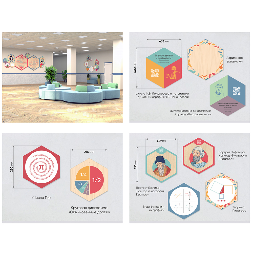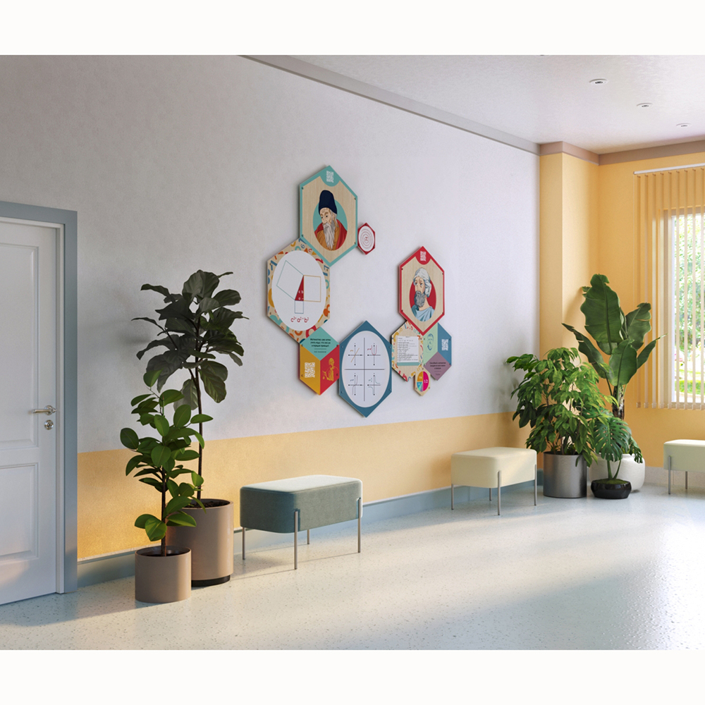 Каждый шестигранник содержит обучающую информацию: портреты выдающихся людей, их достижения и великие цитаты, основные постулаты науки, формулы, графики, теоремы. Благодаря qr-кодам дети могут подробнее узнать об учёных, изображённых на портретах, стоит только навести на них телефон.