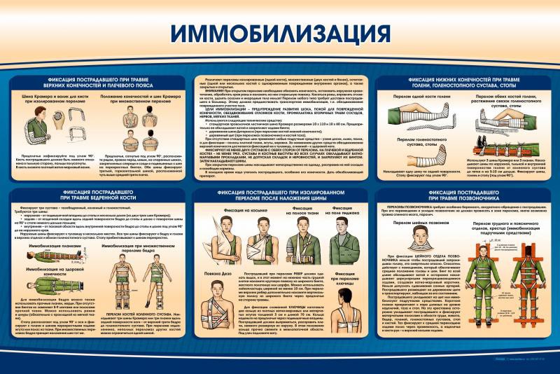Стенд представляет собой полноцветную панель, на которой размещена информация по приёмам иммобилизации пострадавших и правилам их выполнения.