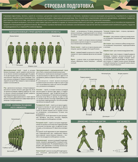 Стенд представляет собой информационную панель, на которой размещены основные положения строевой подготовки. Стенд предназначен для наглядного отображения информации об особенностях строевой подготовки, а также для выработки у учащихся или курсантов строевой выправки, аккуратности, подтянутости, выносливости и воинской дициплины.