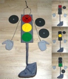 Светофор выглядит как ростовый карнавальный костюм, быстро надевается на ребенка. На шею надевается регулируемая тесемочка, на руки надеваются «варежки», а на ноги – «валенки», и ваш ребенок готов за считанные секунды превратиться в своего любимого персонажа!